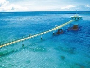 潮風に吹かれて桟橋を歩きながら時々立ち止って海中を覗くと、白い砂の上には青ヒトデ、サンゴの間には現代アートのような模様をしたムラサメモンガラが泳いでいます。エメラルドグリーンからコーラルブルーまで刻々と色が移り変わるサンゴ礁特有の海の色も感動的。誰でも濡れることなく、神秘的な水深10Mの海底の楽園を訪れることが出来ます。